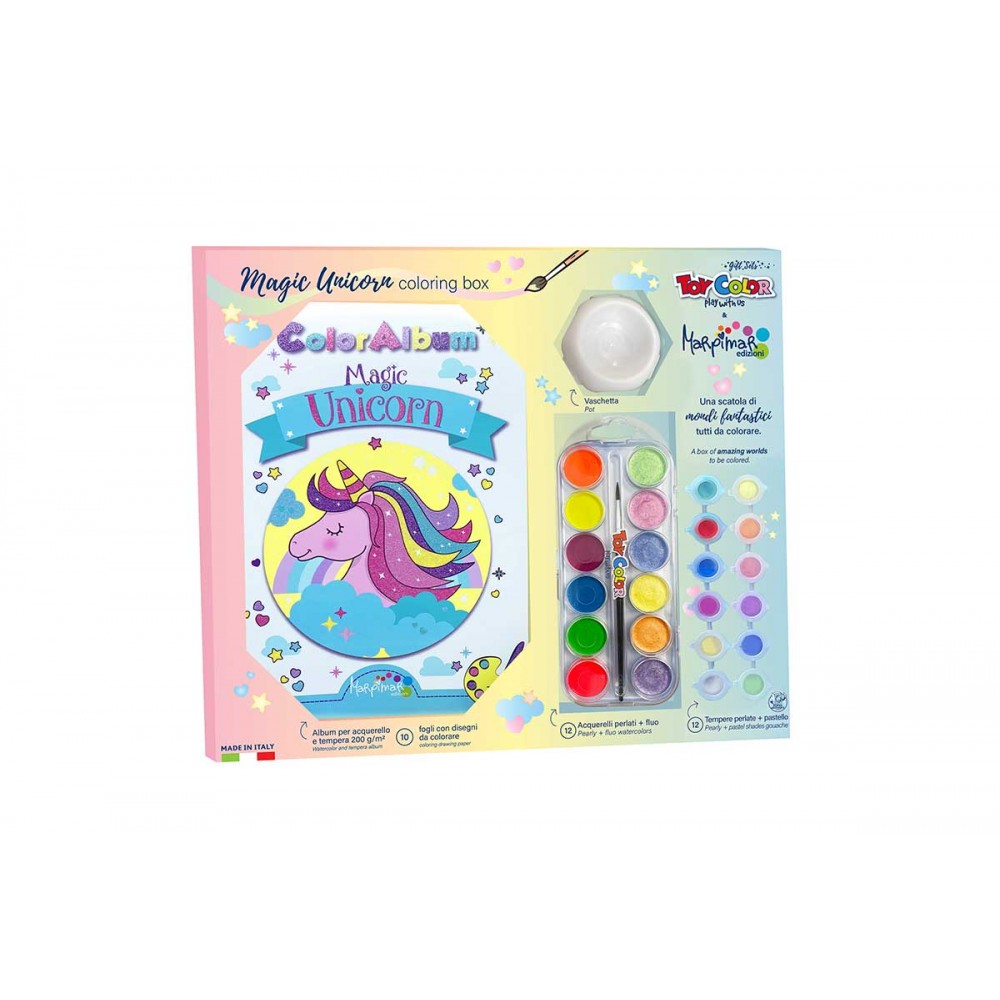 Un Album per acquerello e tempera con 10 fogli di grammatura 200 g/m2, con disegni a tema unicorno, da colorare; una confezione di acquerelli da 12 pastiglie in tonalità perlate e fluo, una stringa di 6 vasetti da 2,5 ml di tempera in colori perlati ed una stringa in tonalità pastello; una vaschetta per miscelare i colori.