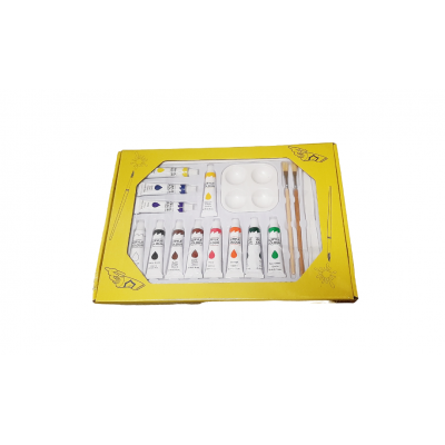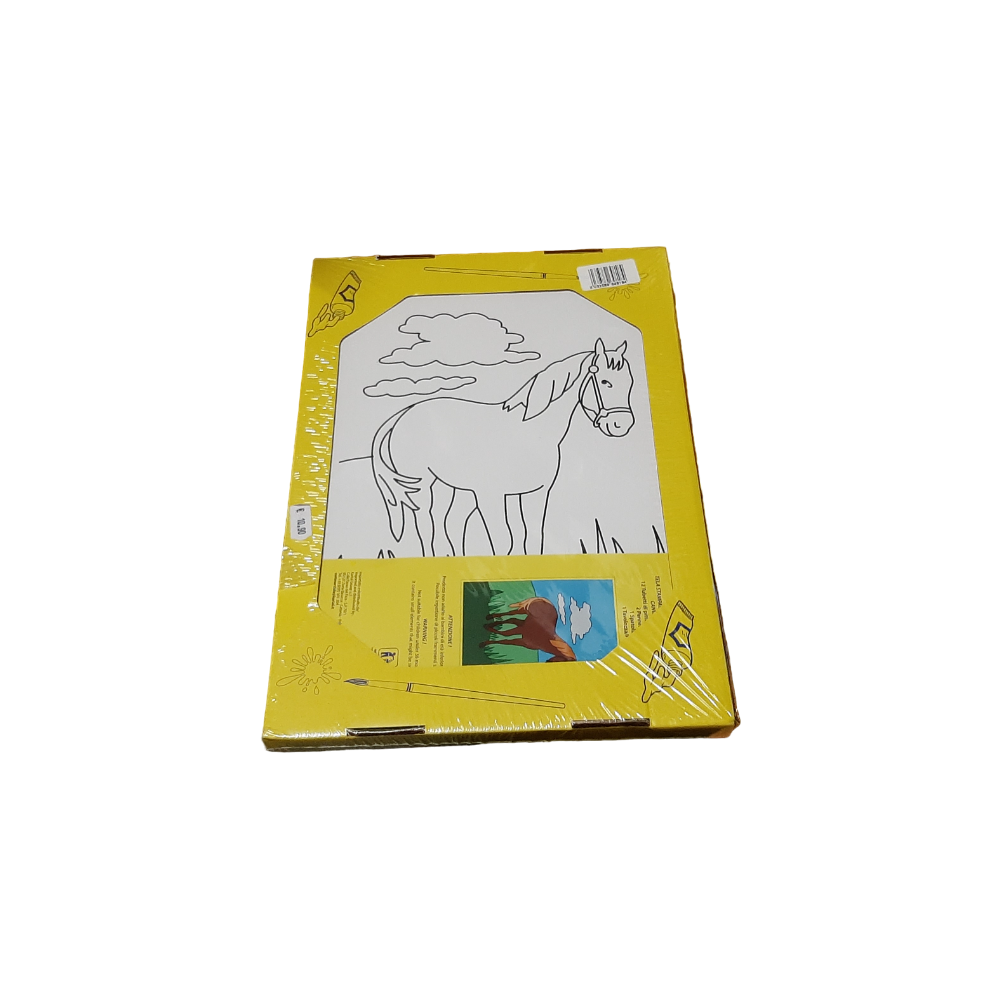 All'interno : 1 Tela Canvas 33 x 25 cm con soggetto Stampato da dipingere, 12 Tubetti di Pittura Acrilica, 2 Pennelli e una Spatola in Plastica,