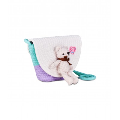 Peluche applicato. Borsina in corda, chiusura con bottone magnetico.